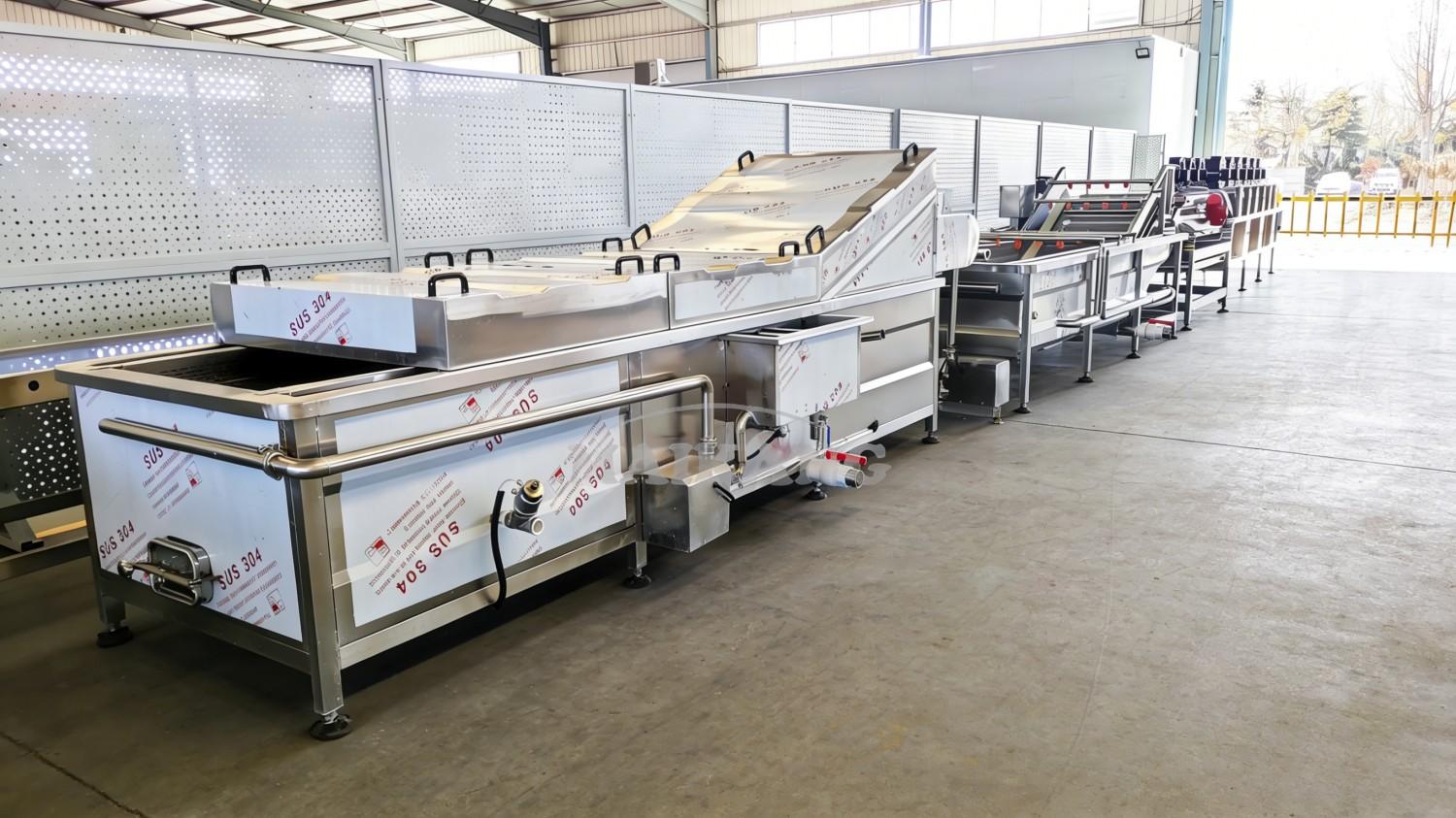 1.Les produits sont acheminés via une bande à mailles dans le réservoir de pasteurisation.